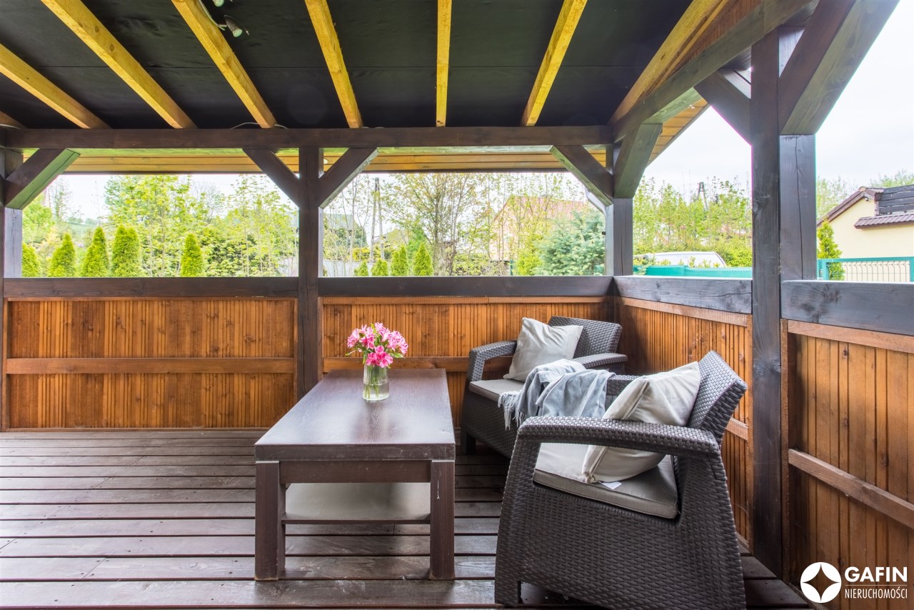 Dom posiada 2 kondygnacje, komórkę na zewnątrz oraz zadaszony taras.